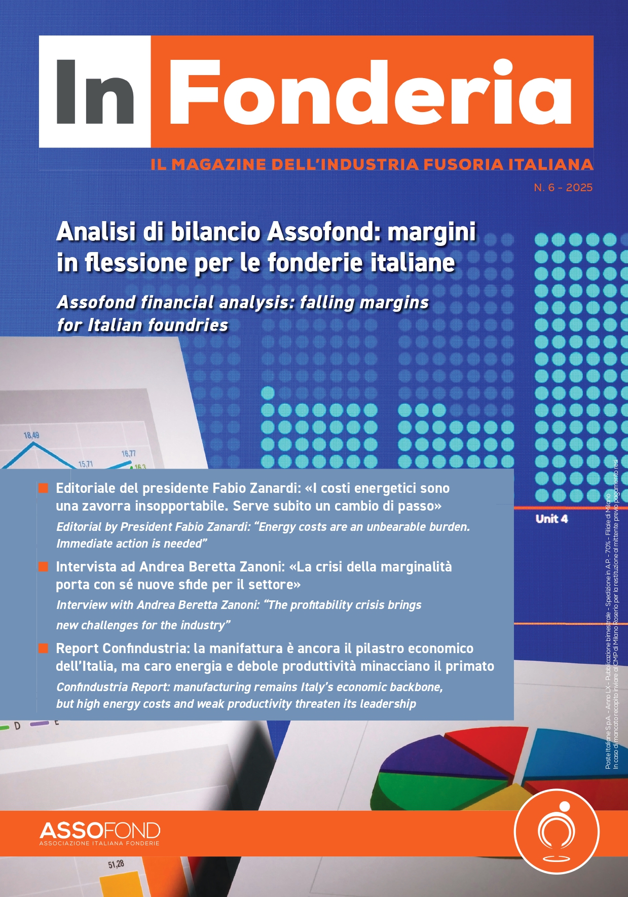 È disponibile la versione digitale del sesto numero del 2025 di "In Fonderia", il magazine bimestrale di Assofond. In primo piano, In primo piano un dossier dedicato all'ultima edizione dell'analisi di bilancio realizzata dal Centro Studi Assofond su un campione rappresentativo di imprese del settore.