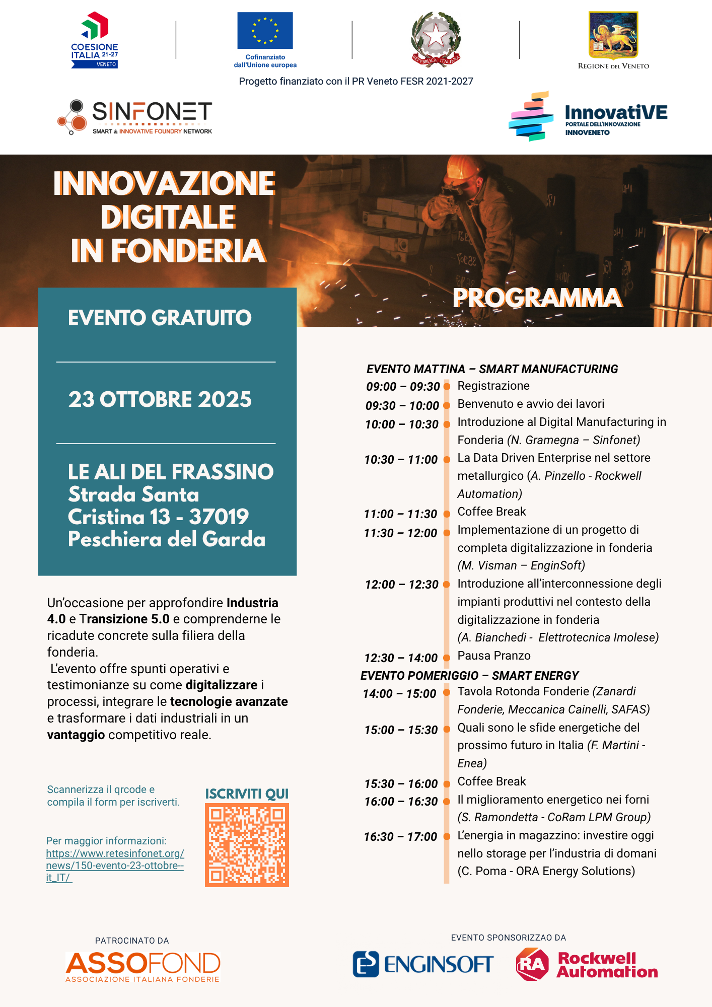 Giovedì 23 ottobre a Peschiera del Garda (VR), presso l'hotel "Le ali del frassino", è in programma una giornata di studio promossa da SINFONET, con il patrocinio di ASSOFOND, dedicata ai percorsi utili per esprimere il pieno potenziale d’impresa. Un’occasione rivolta a fonderie, aziende della filiera per la produzione di componenti e prodotti metalmeccanici, ma anche a Operation Manager, Energy Manager, Responsabili di Produzione e Controllo Qualità.